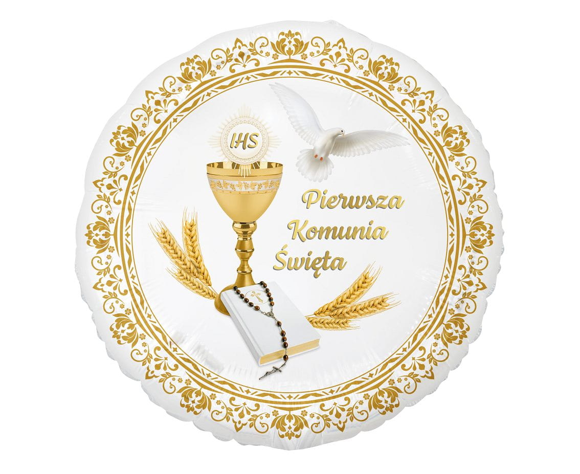 Balon foliowy komunijny okrągły na hel. Wymiar po nadmuchanie 35 cm.