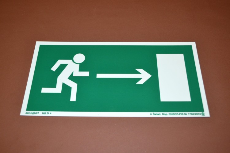 Tablica informacyjna PCV, ewakuacyjna, świecąca w ciemności, o wymiarze 15 x 30 cm.