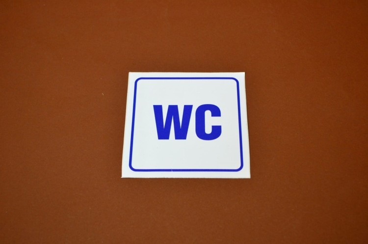 KOLOR BIAŁY. TOALETA WC. Naklejka informacyjna o wymiarze 10,5 x 10,5 cm.