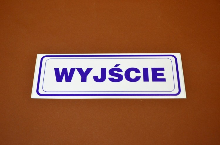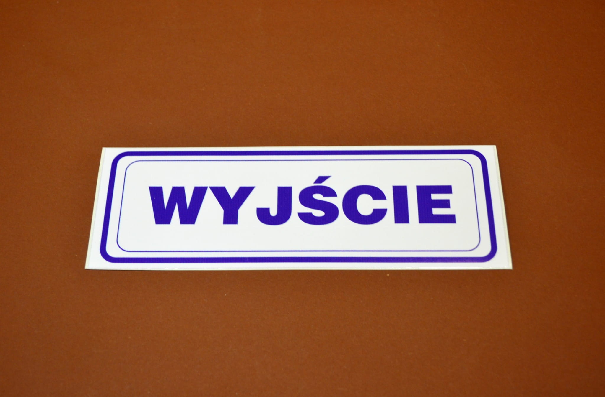 WYJŚCIE. Naklejka informacyjna o wymiarze 8 x 21 cm.