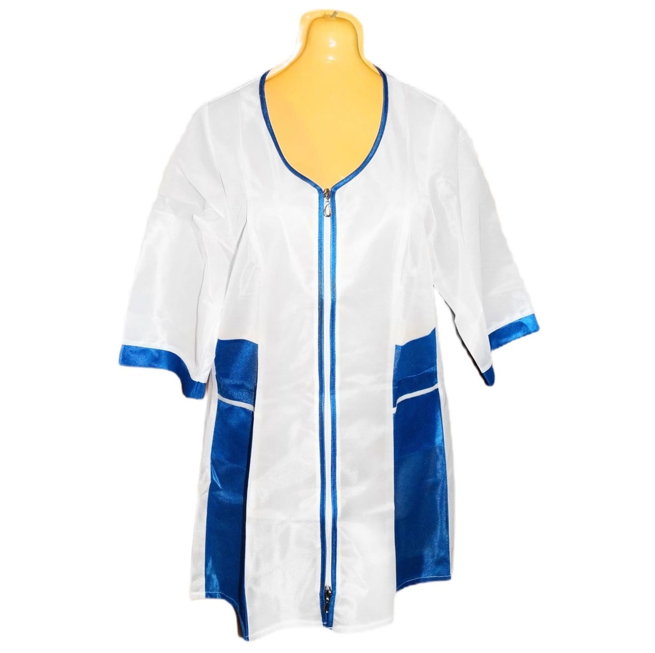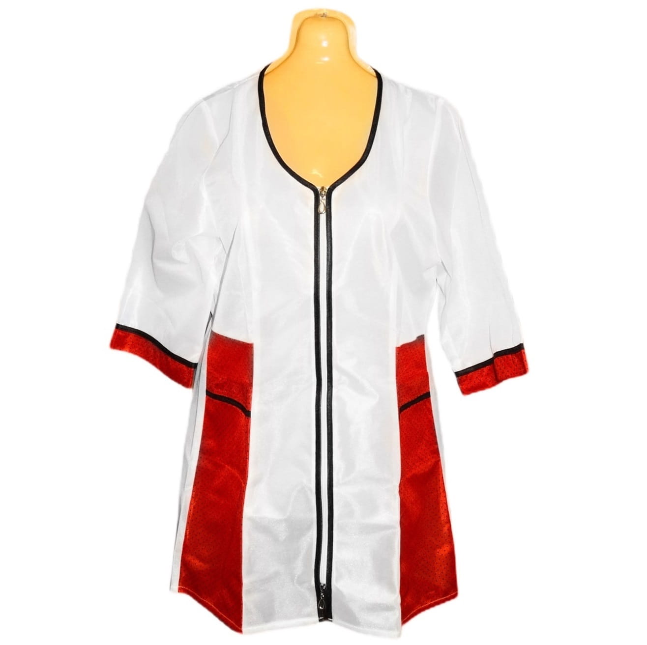 Fartuch damski z rękawem 3/4, dekoracyjnymi kolorowymi wstawkami i zapięciem na suwak. Materiał: stilon. Gramatura: 80 g/m2.