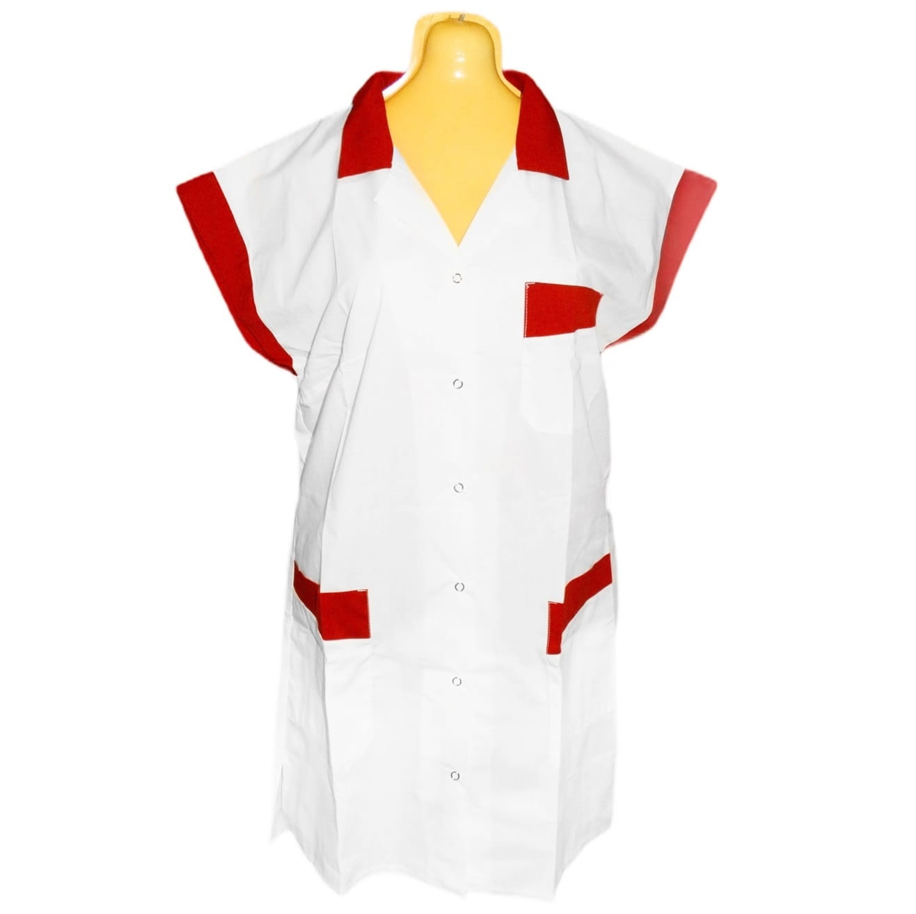 Fartuch damski z krótkimi rękawami i dekoracyjnymi wstawkami przy kołnierzu, rękawach i kieszeniach oraz z wiązaniem z tyłu. Materiał: elanobawełna. Gramatura: 125 g/m2.