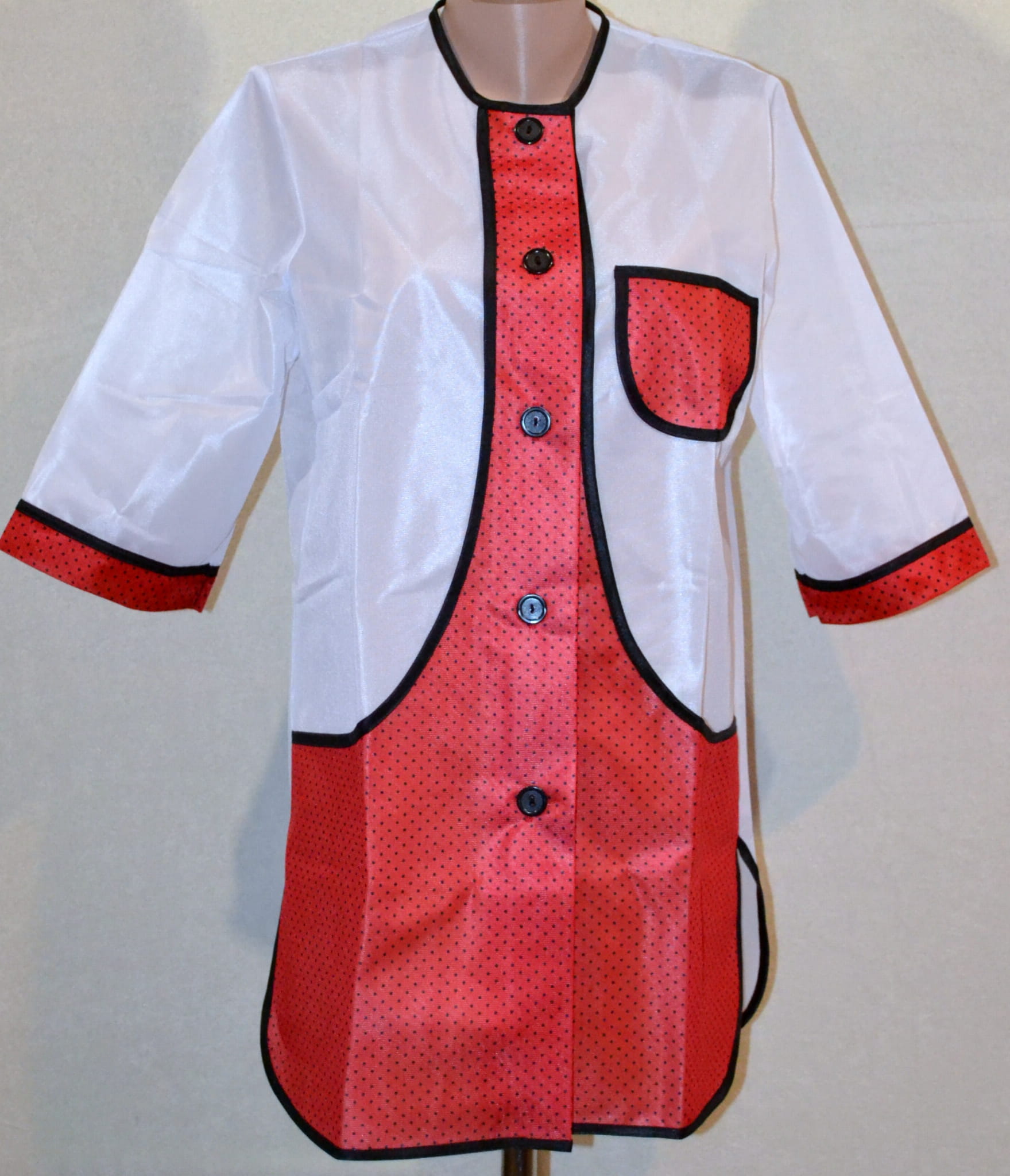 KOLOR BIAŁY Z CZERWONYMI DODATKAMI. Fartuch stilon 80g/m2, zapinany na guziki. Dostępny z dodatkami w kolorach czerwonym, zielonym, niebieskim, żółtym.