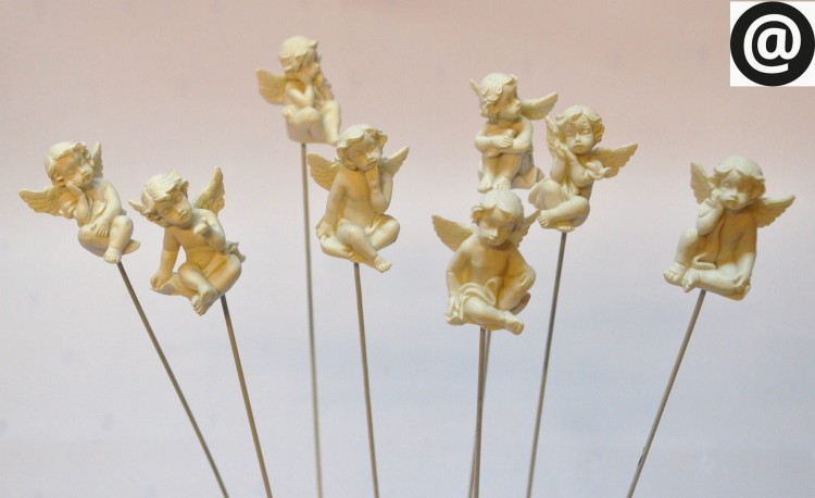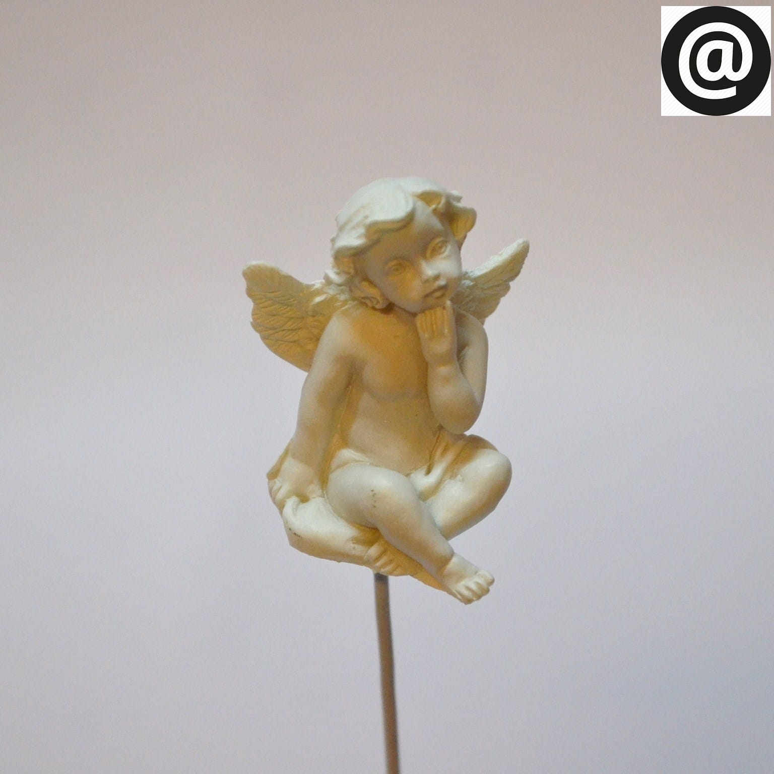 Figurka przedstawiająca aniołka na drucie, wykonana z tworzywa, do prac florystycznych, bukiecików, ozdób itp. Długość drucika to 23 cm, a wysokość aniołka to 3,5 cm. Produkt wysyłany losowo bez możliwości wyboru.