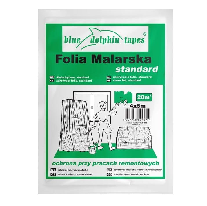 Folia ochronna do zabezpieczeń w rozmiarze 4x5 m, do ochrony przed kurzem, farbą i wilgocią.