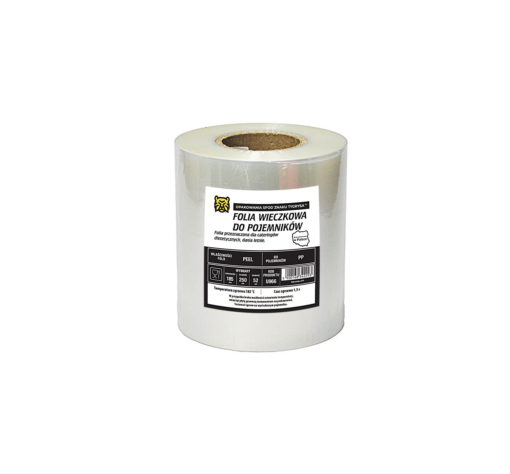 Folia do zgrzewania pojemników na wynos o szerokości 18,5 cm długość 250mb i grubości 52 mikrony, z funkcja PEEL (łatwo odrywalna).