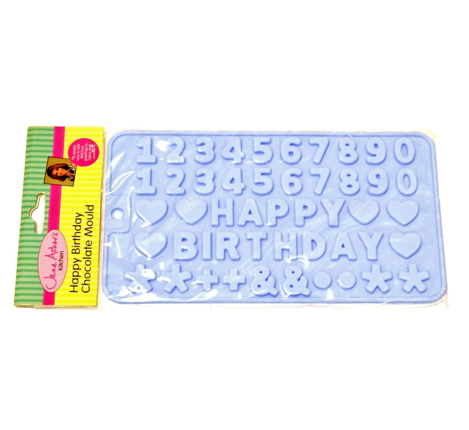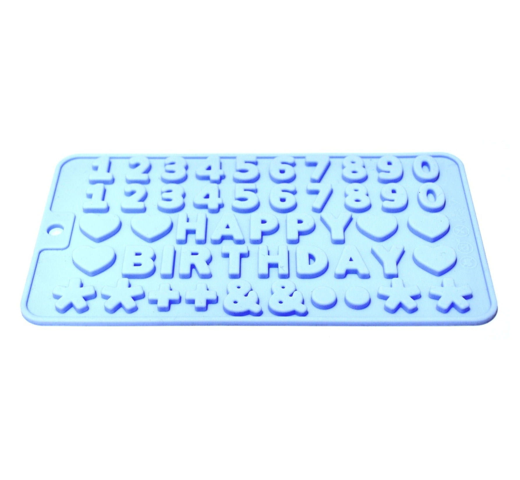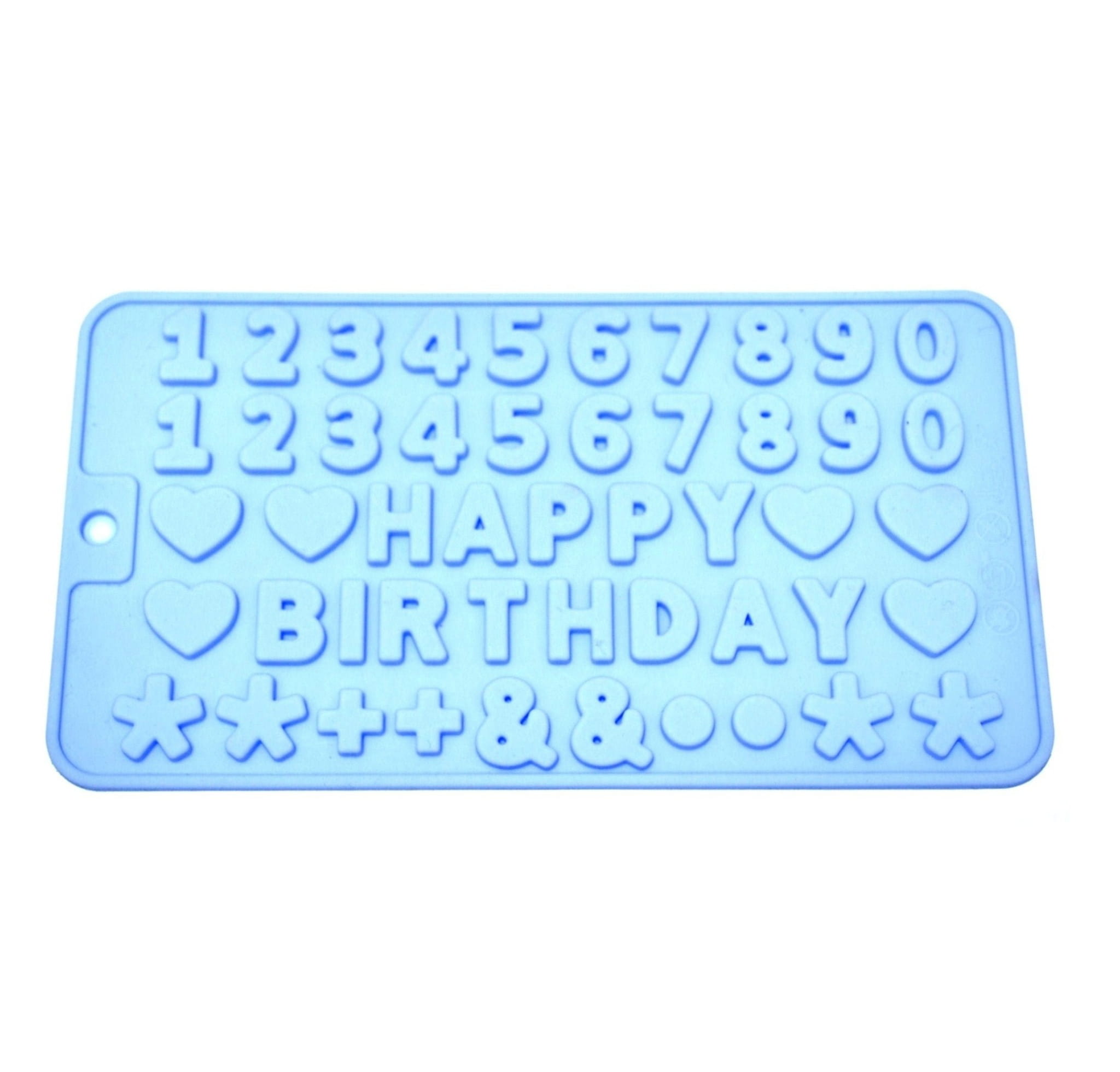 Foremki do odlewania czekoladowych literek tworzących napis "HAPPY BIRTHDAY", a także ceferek, serduszek, gwiazdek itp. Wymiar foremki: 11,5 x 21 cm.