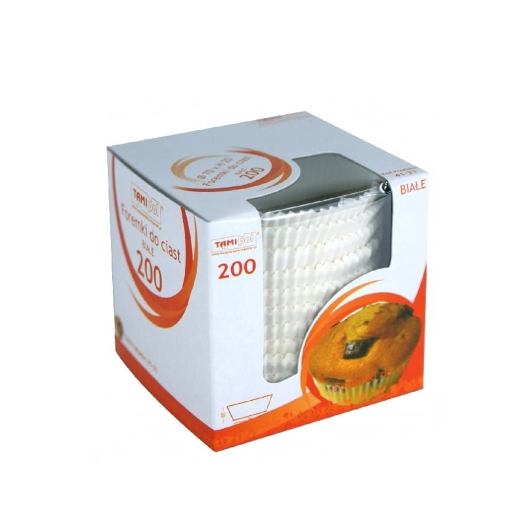 Foremki papierowe do wypieku babeczek o średnicy 45 mm i wysokości 25 mm, atestowane, pakowane w kartonik po 200 szt.