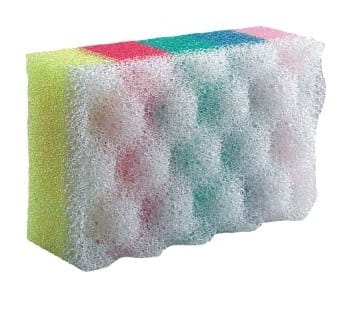 Dwuwarstwowa gąbka kąpielowa o wymiarach 9 x 14,5 x 5 cm.