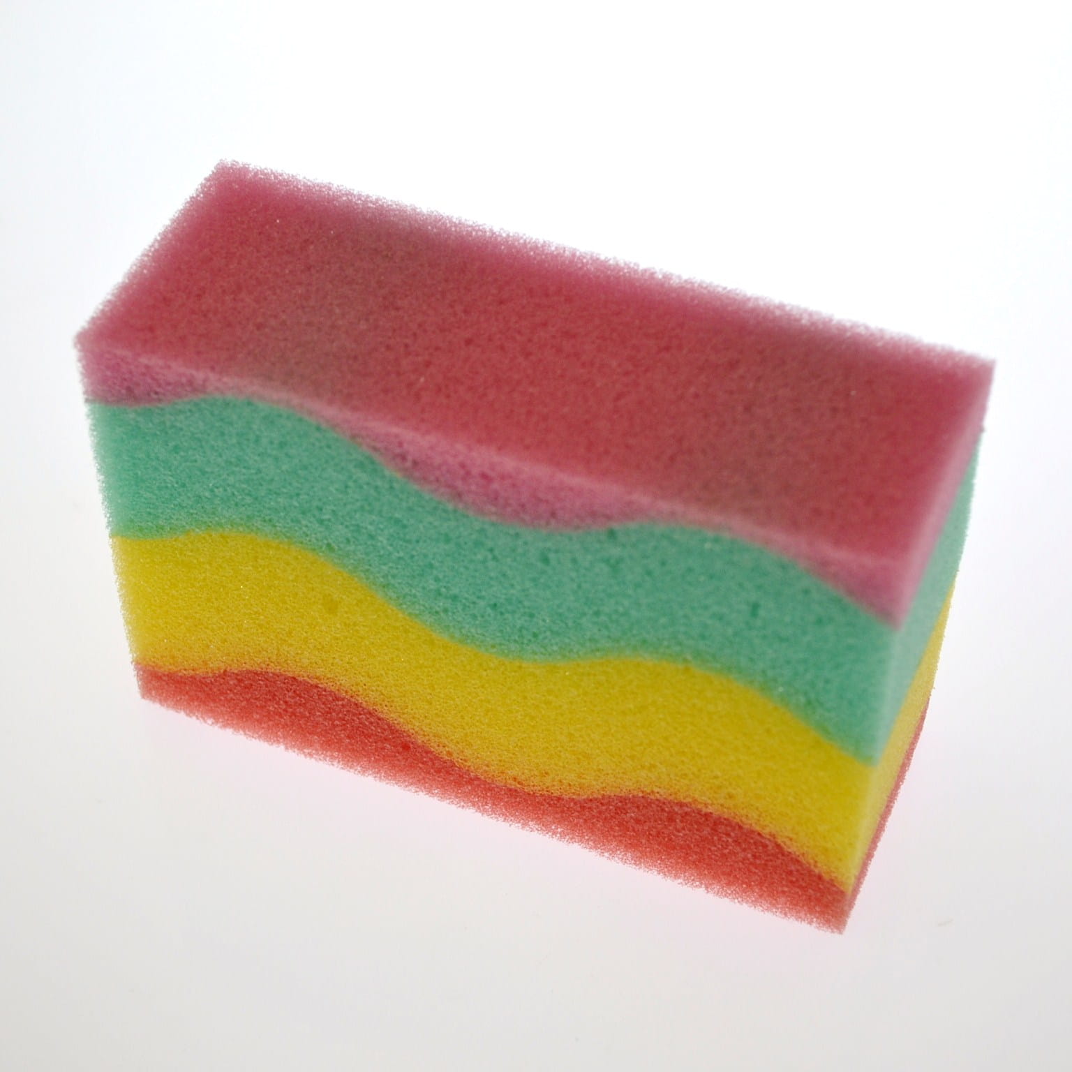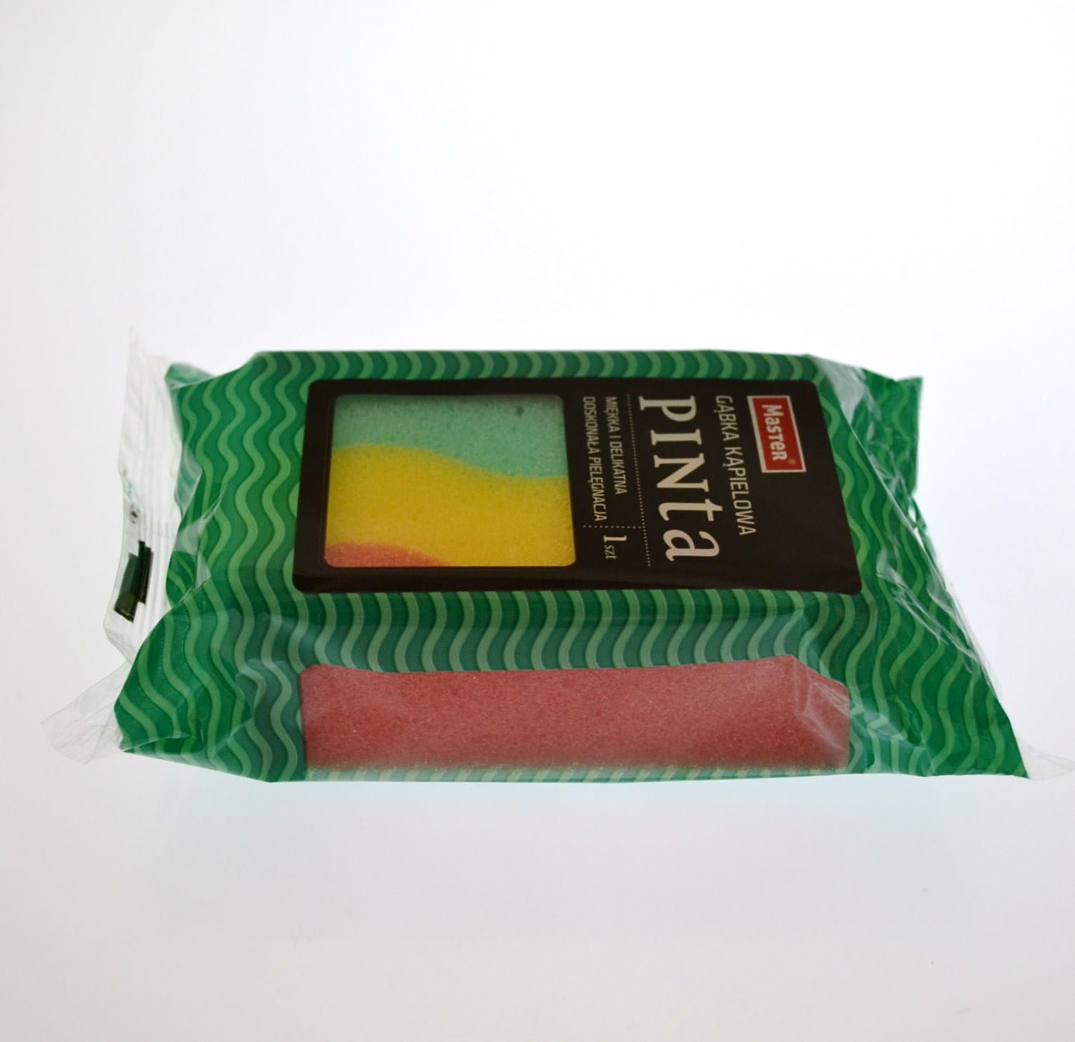 Gąbka kąpielowa pinta, o wymiarach 8,5 x 13,5 x 5 cm, jednowarstwowa.