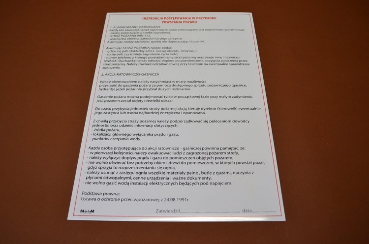 Tablica informacyjna PCV, instrukcja, o wymiarze 25 x 35 cm.