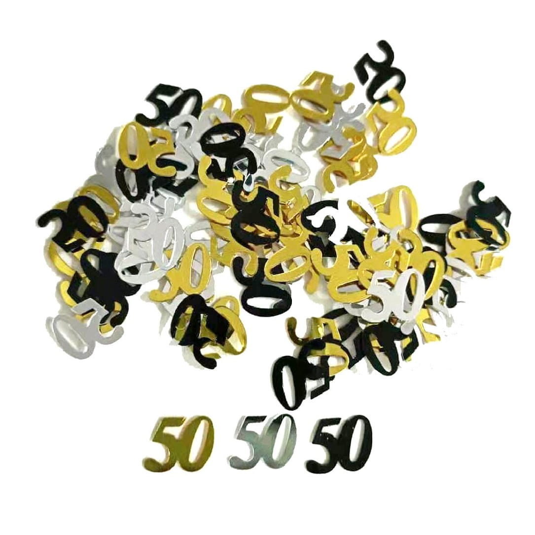 Konfetti pod postacią złotych, srebrnych i czarnych liczb "50" dedykowane pod imprezę urodzinową. Waga opakowania: 18 g.