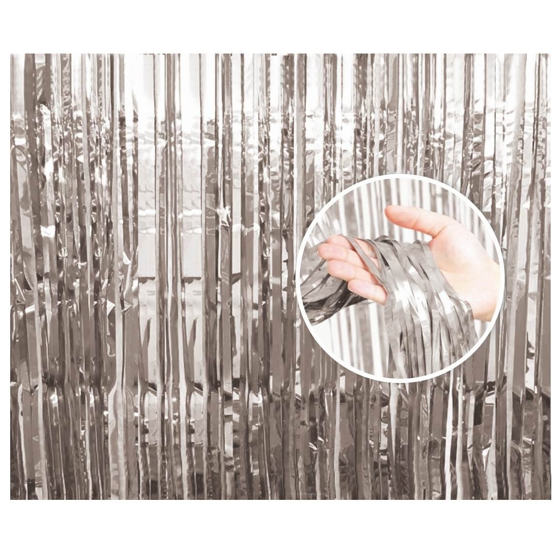 Kurtyna dekoracyjna wykonana z metalicznych pasków o szerokości 90 cm i wysokości 240 cm.