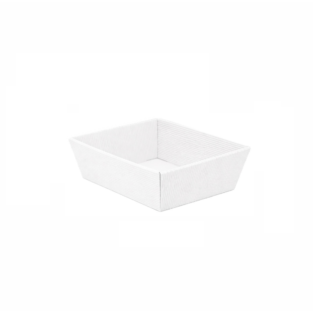 Koszyk prezentowy prostokątny wykonany z wysokiej jakości tektury falistej prążkowanej. Wymiary złożonego kartonu: długość 26 cm, szerokość 21 cm, wysokość: 7 cm. Wymiary podstawy kartonu: długość 22 cm, szerokość 18 cm. W zestawie: 10 sztuk pudełek.