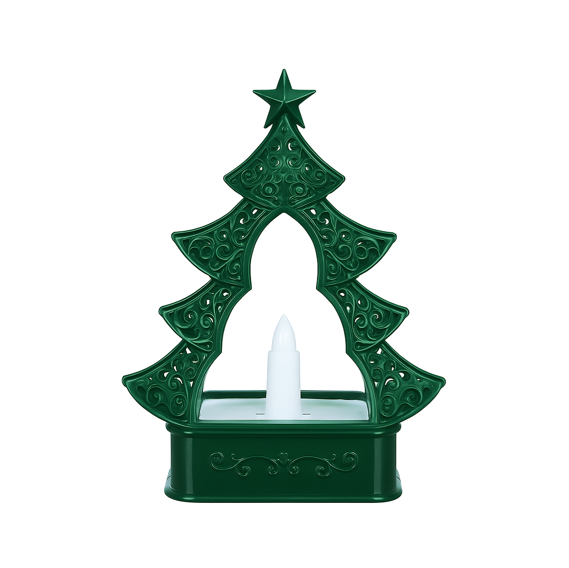 Lampion ledowy w kształcie zielonej choinki o wymiarach: wysokość 17 cm, szerokość 13 cm i głębokość 5 cm. Zasilany trzema bateriami R3 (brak w zestawie).