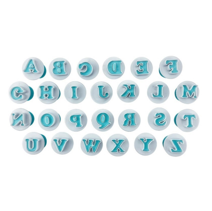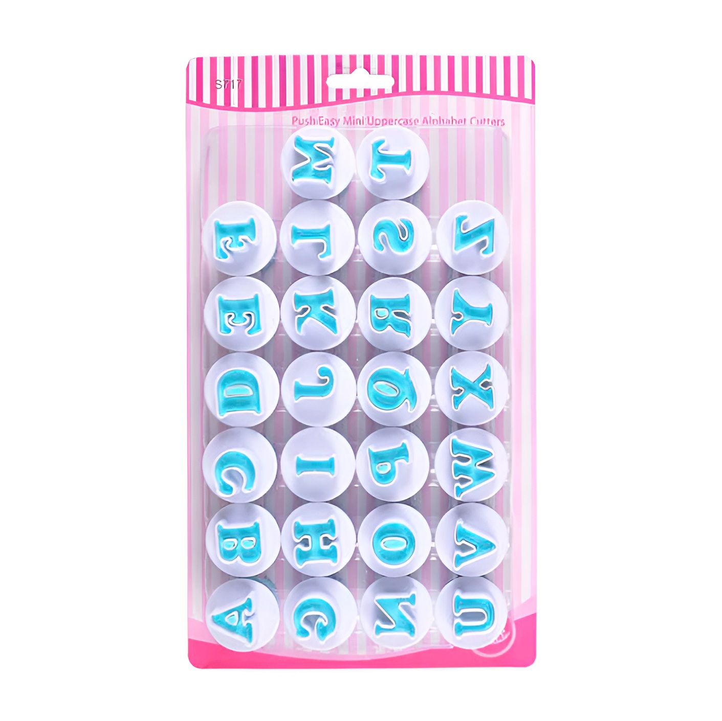 Literki alfabetu (duże drukowane) do wykrawania masy cukrowej. Proste w obsłudze - każdy wykrawacz posiada tłoczek umożliwiający wyciśnięcie wykrojonej literki. Wykonane z materiałów bezpiecznych dla zdrowia, łatwo się czyszczą i nie przechodzą zapachami.