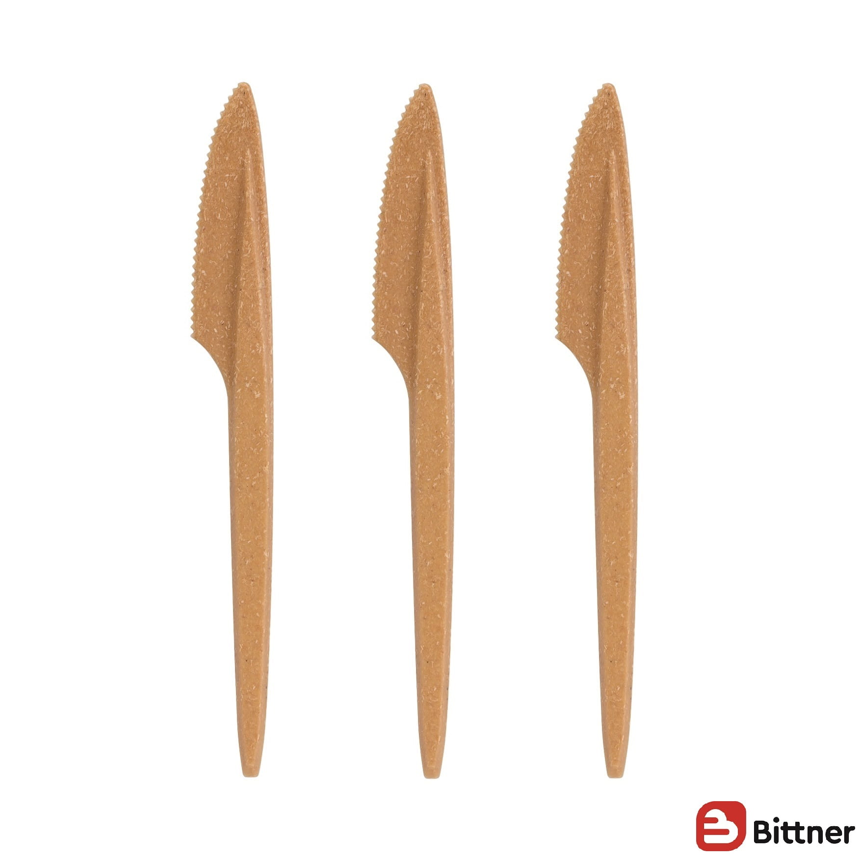 Nóż wielorazowy z możliwością mycia w zmywarce wykonany z tworzywa WPC (Wood Plastic Composite) tj. polimeru z 40% dodatkiem produktu pochodzenia naturalnego sztywne i wytrzymałe do 100 st C