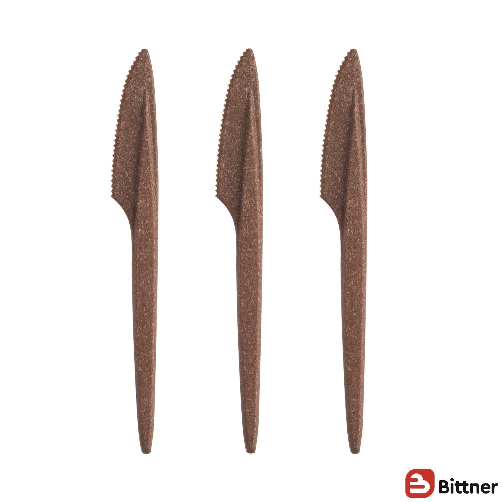 Nóż wielorazowy z możliwością mycia w zmywarce wykonany z tworzywa WPC (Wood Plastic Composite) tj. polimeru z 40% dodatkiem produktu pochodzenia naturalnego sztywne i wytrzymałe do 100 st C.
