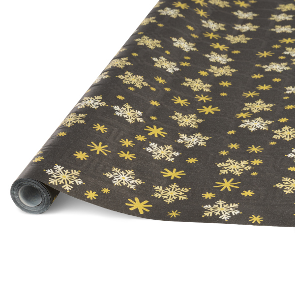 CZARNY W ŚNIEŻYNKI. Obrus papierowy na roli o wymiarach 118 cm x 6 mb, wytłaczany, jednorazowy, niezastąpiony na imprezach plenerowych, cateringach, party.