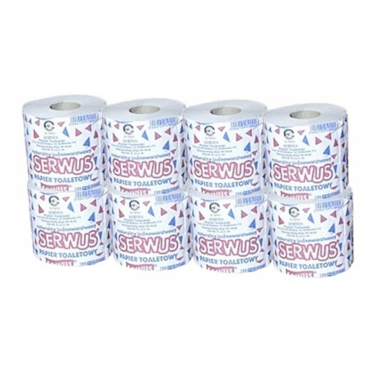 Papier toaletowy Servus, 1 warstwa, 8 rolek, 300 listków, długość rolki 36 metrów.