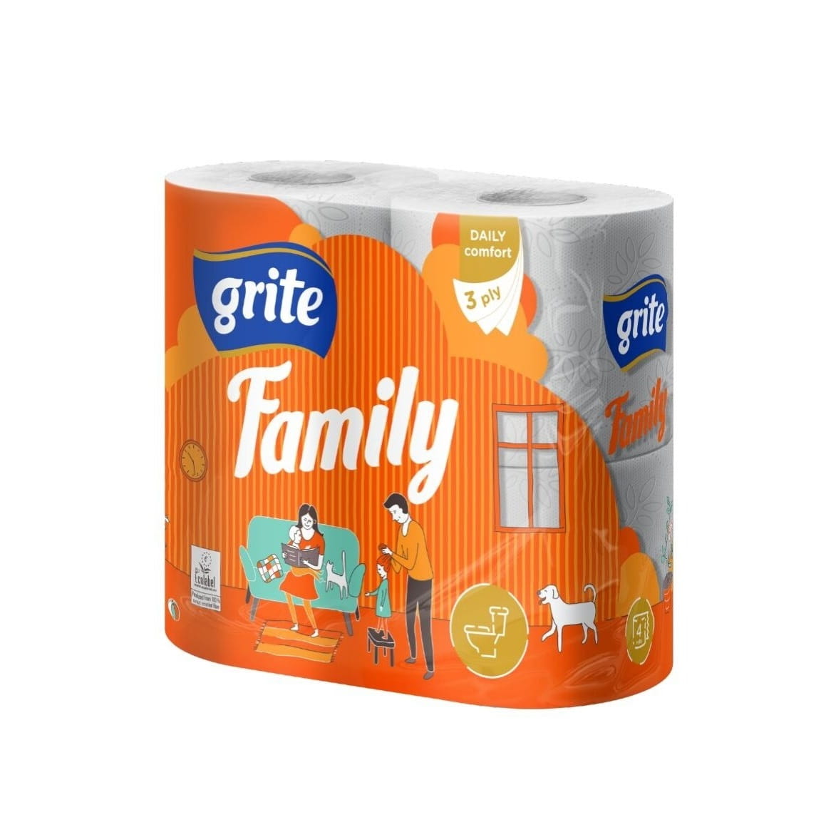Papier toaletowy Grite Family, 3 warstwy, 4 rolki, 145 listków, długość rolki 15,95 metra. Wykonany z włókniny sortowanej w kolorze białym z ozdobnym, błękitnym tłoczeniem.