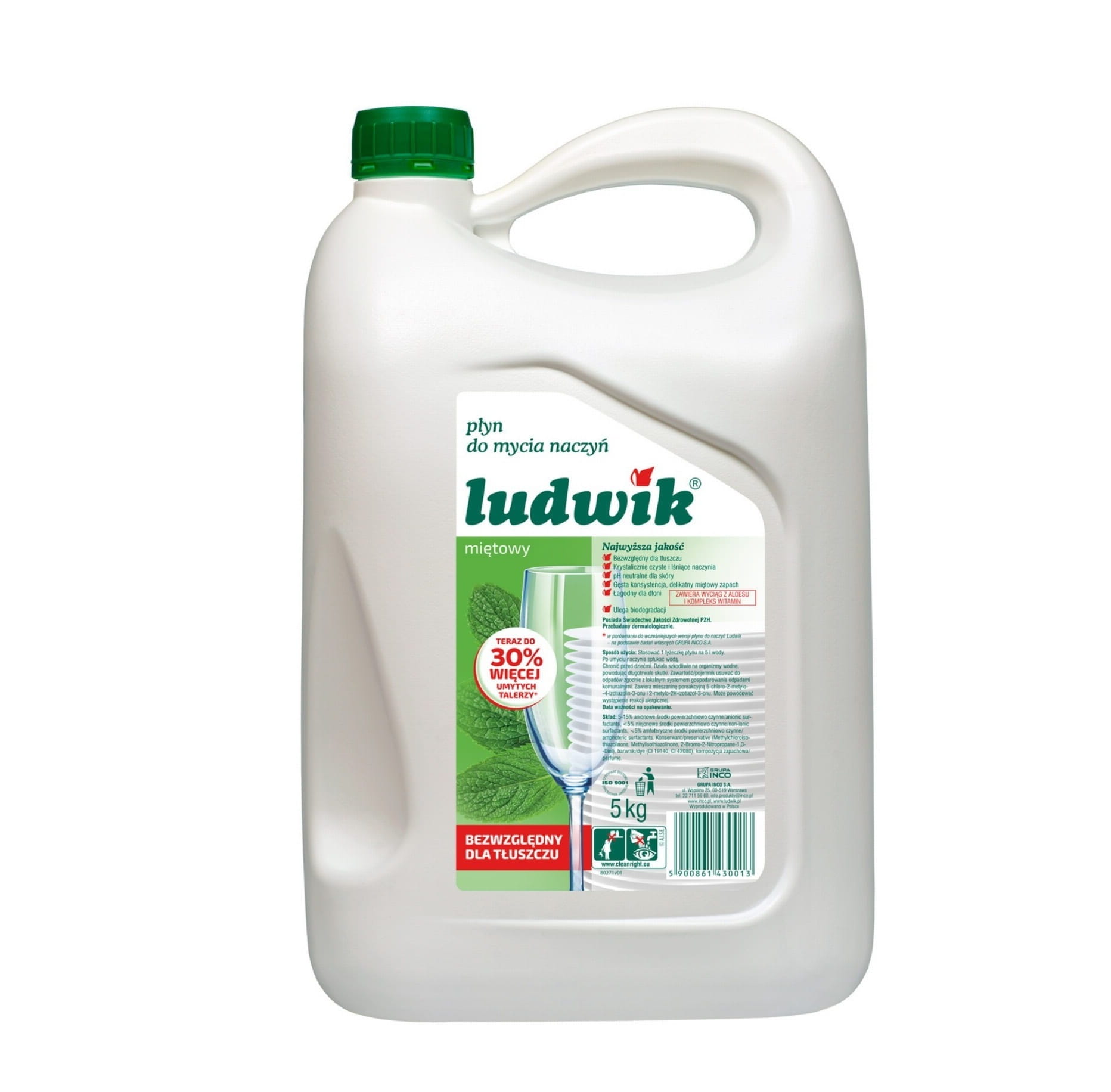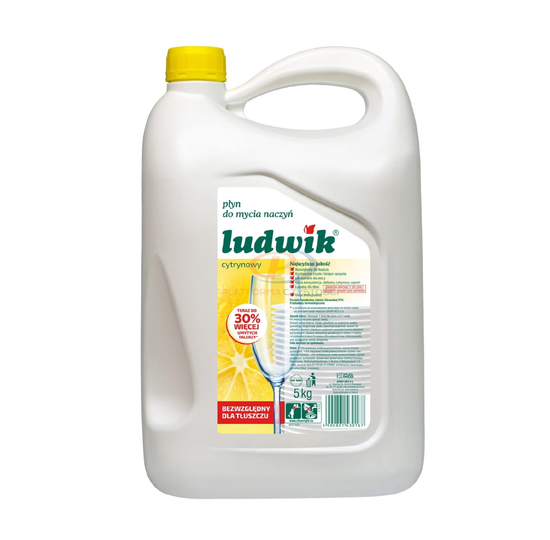 Bezpieczny dla skóry płyn do mycia naczyń marki Ludwik. Skutecznie usuwa zabrudzenia i tłuszcz z naczyń nawet w zimnej wodzie, nie pozostawia zacieków i nadaje wysoki połysk mytym powierzchniom. Pojemność 5 l.
