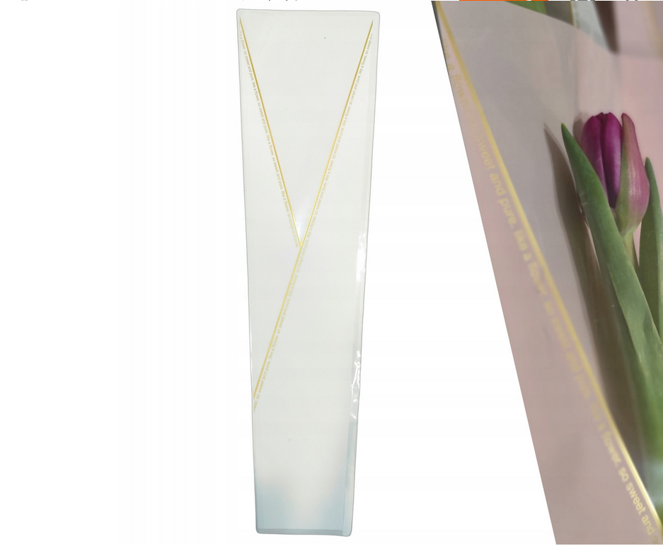 Rożek foliowy Sweet jedynka o wysokości 50 cm i szerokości góry rożka 15 cm. Tylna folia w kolorze nieprześwitująca natomiast przód częściowo nieprześwitujący z przerżoczystym wycięciem w kształcie V. Opakowanie zawiera 50 szt.