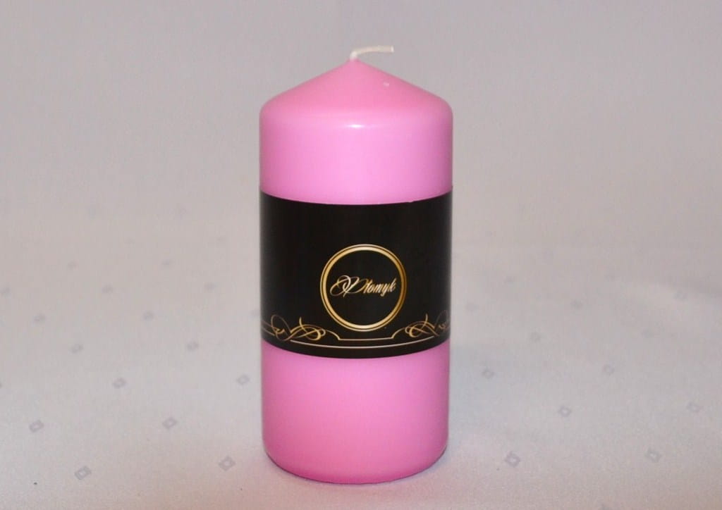 KOLOR RÓŻOWY JASNY. Świeca słupek o wysokości 15 cm i średnicy 7 cm, matowa, niekapiąca, wypala się do środka, przybliżony czas palenia: 75 godzin, szeroka kolorystyka, produkt polski.