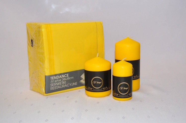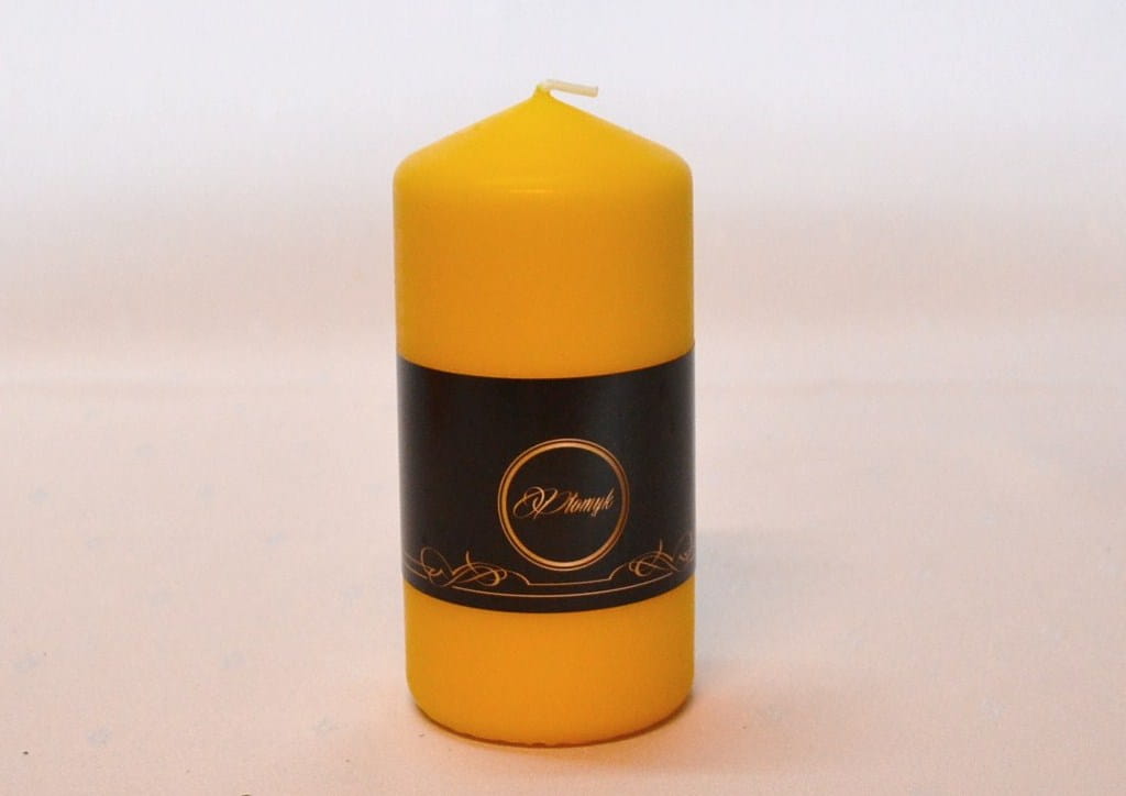 KOLOR ŻÓŁTY. Świeca słupek o wysokości 15 cm i średnicy 7 cm, matowa, niekapiąca, wypala się do środka, przybliżony czas palenia: 75 godzin, szeroka kolorystyka, produkt polski.