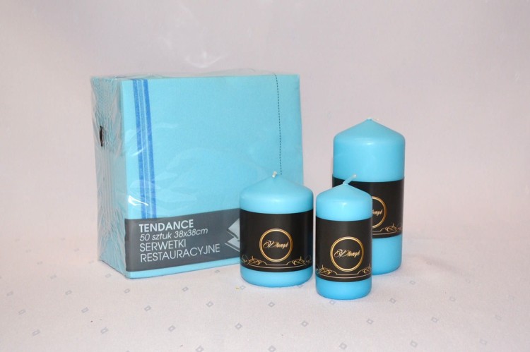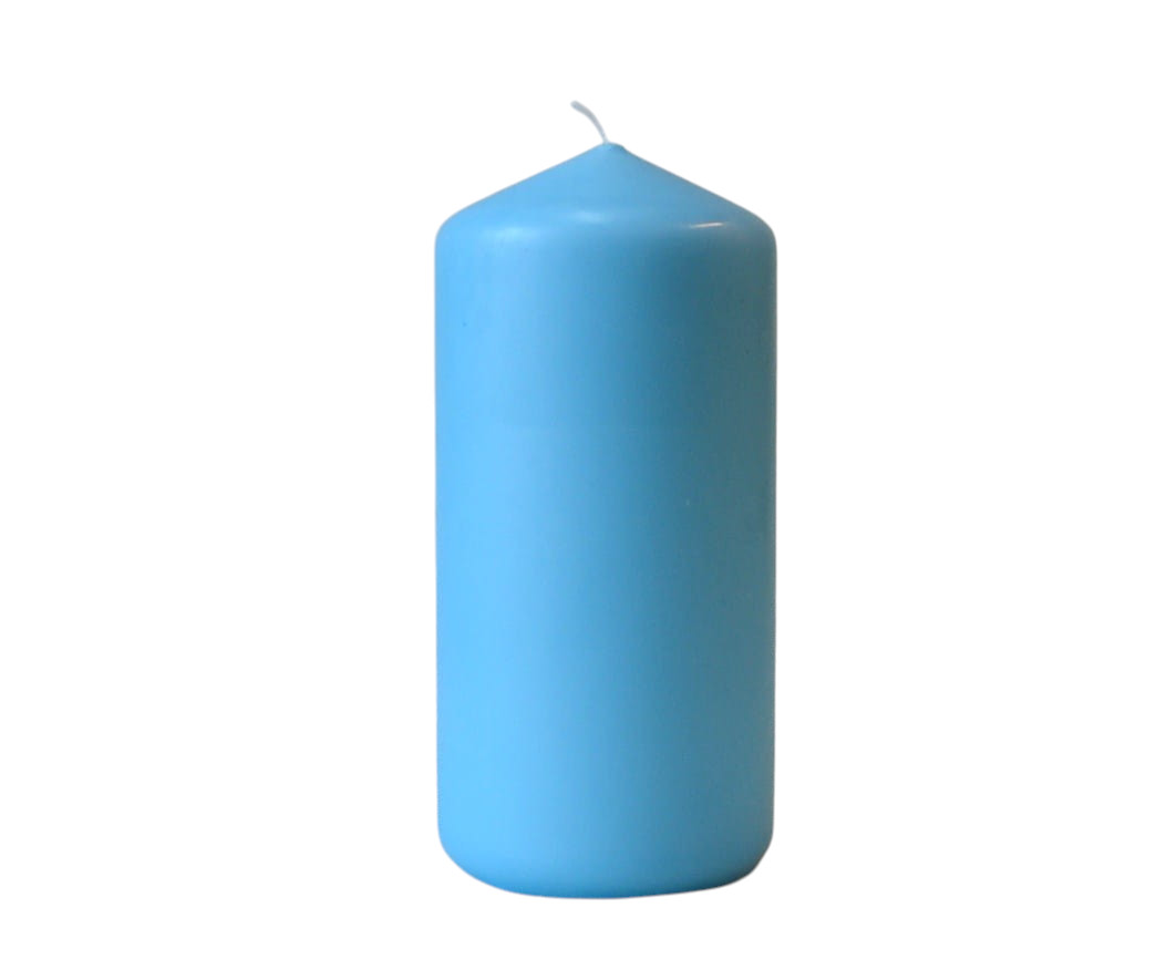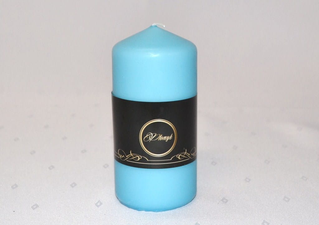KOLOR NIEBIESKI JASNY. Świeca słupek o wysokości 15 cm i średnicy 7 cm, matowa, niekapiąca, wypala się do środka, przybliżony czas palenia: 75 godzin, szeroka kolorystyka, produkt polski.