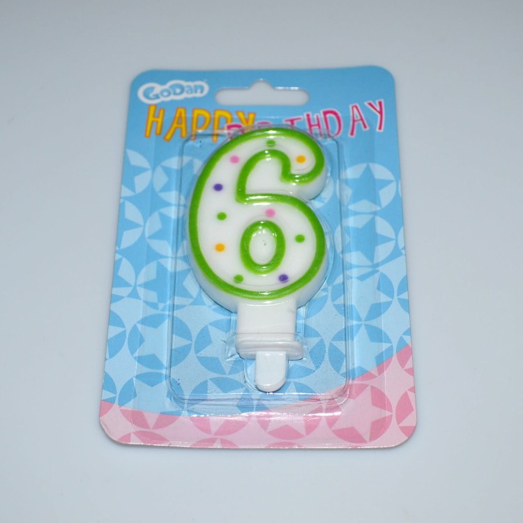 Świeczki urodzinowe cyferka w kolorowe groszki, o wysokości 7,5 cm, pakowana na blistrze.