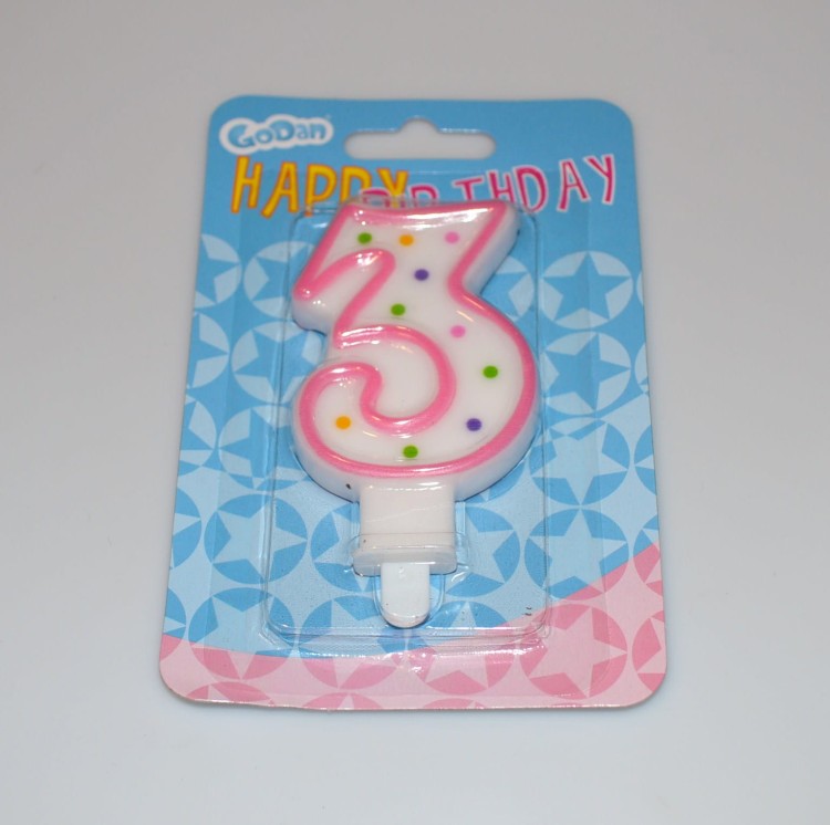 Świeczki urodzinowe cyferka w kolorowe groszki, o wysokości 7,5 cm, pakowana na blistrze.