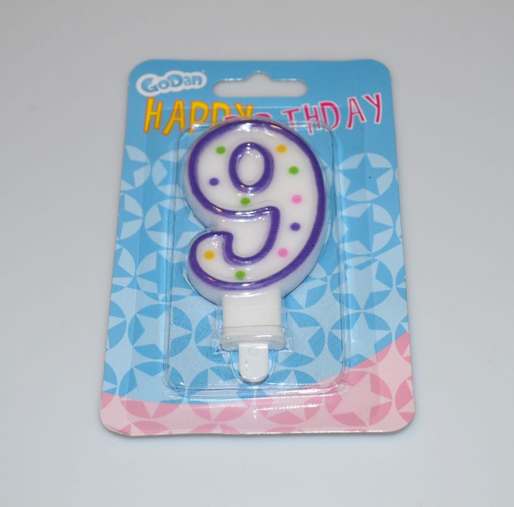 Świeczki urodzinowe cyferka w kolorowe groszki, o wysokości 7,5 cm, pakowana na blistrze.