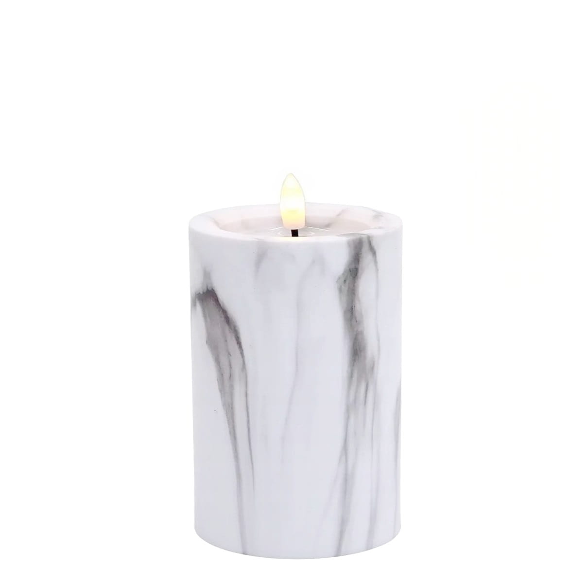 Świeca LED z wzorem imitującym marmur, zasilana dwiema bateriami R6 (brak w zestawie). Wysokość 10 cm (12 cm z knotem), średnica 7,5 cm.