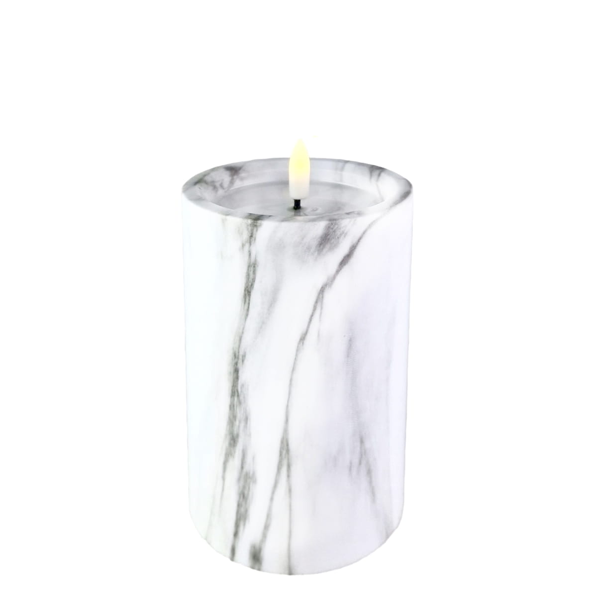 Świeca LED z wzorem imitującym marmur, zasilana dwiema bateriami R6 (brak w zestawie). Wysokość 12,5 cm (14,5 cm z knotem), średnica 7,5 cm.
