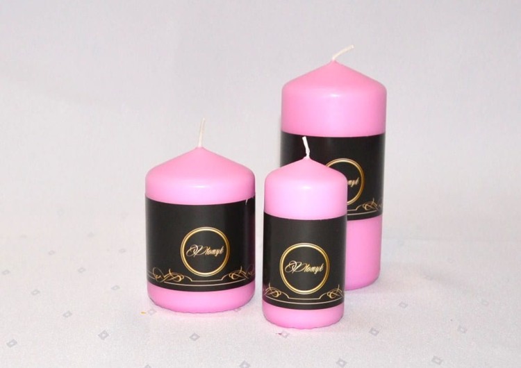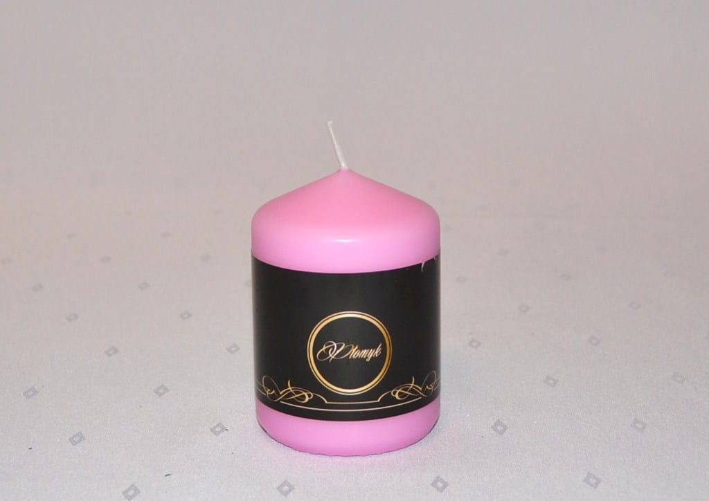KOLOR RÓŻOWY JASNY. Świeca słupek o wysokości 10 cm i średnicy 7 cm, matowa, niekapiąca, wypala się do środka, przybliżony czas palenia: 50 godzin, szeroka kolorystyka, produkt polski.