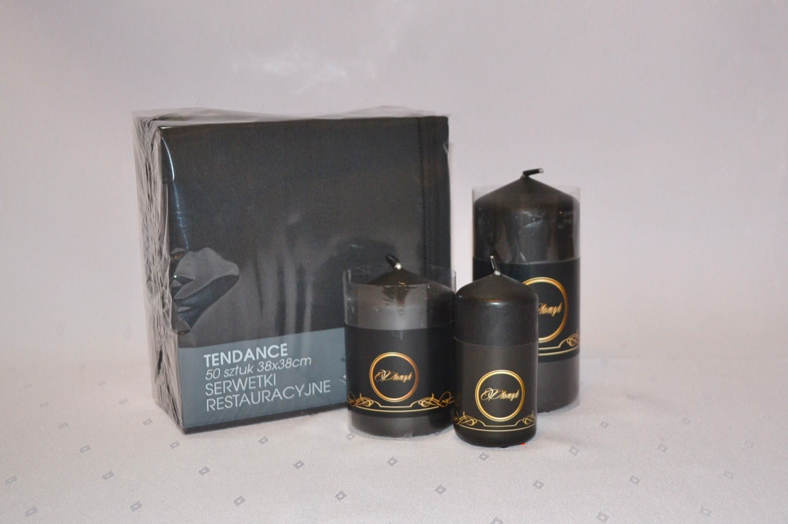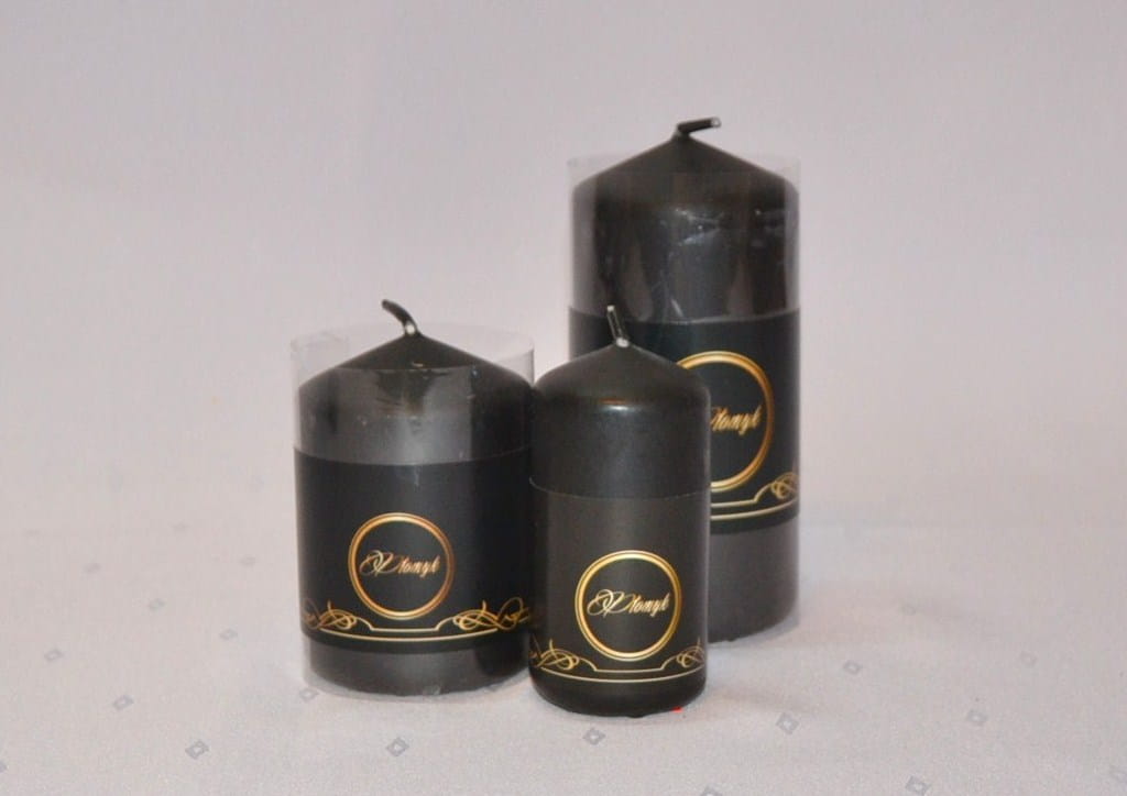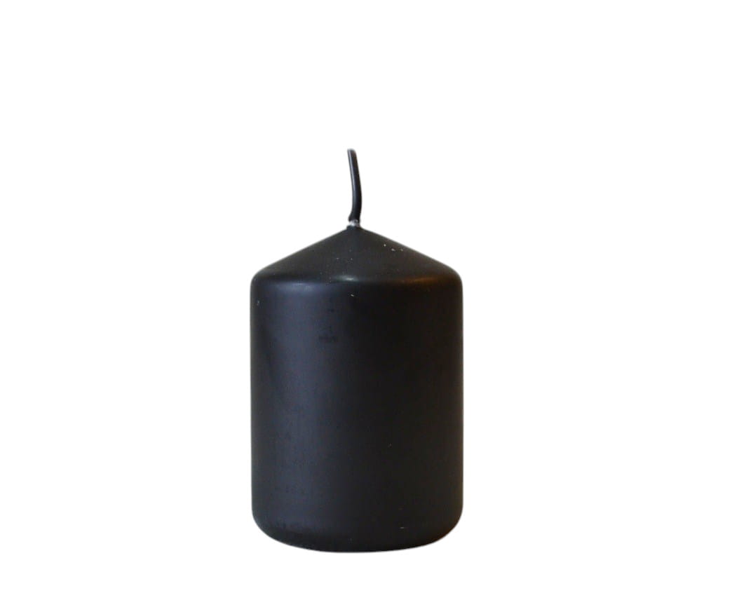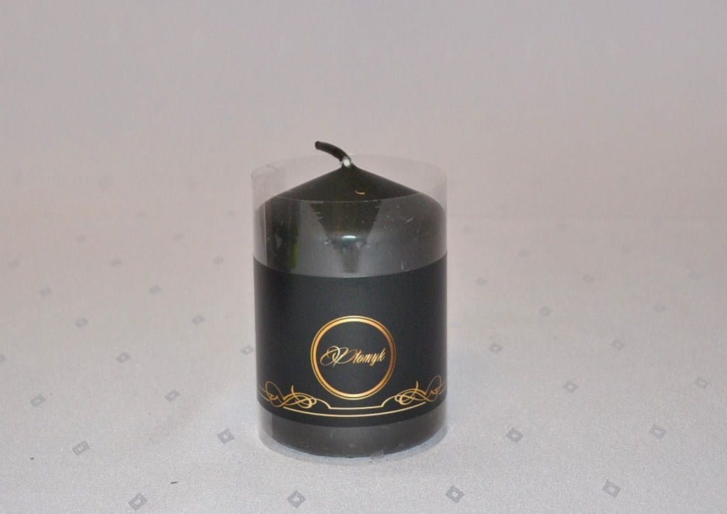 KOLOR CZARNY. Świeca słupek o wysokości 10 cm i średnicy 7 cm, matowa, niekapiąca, wypala się do środka, przybliżony czas palenia: 50 godzin, szeroka kolorystyka, produkt polski.