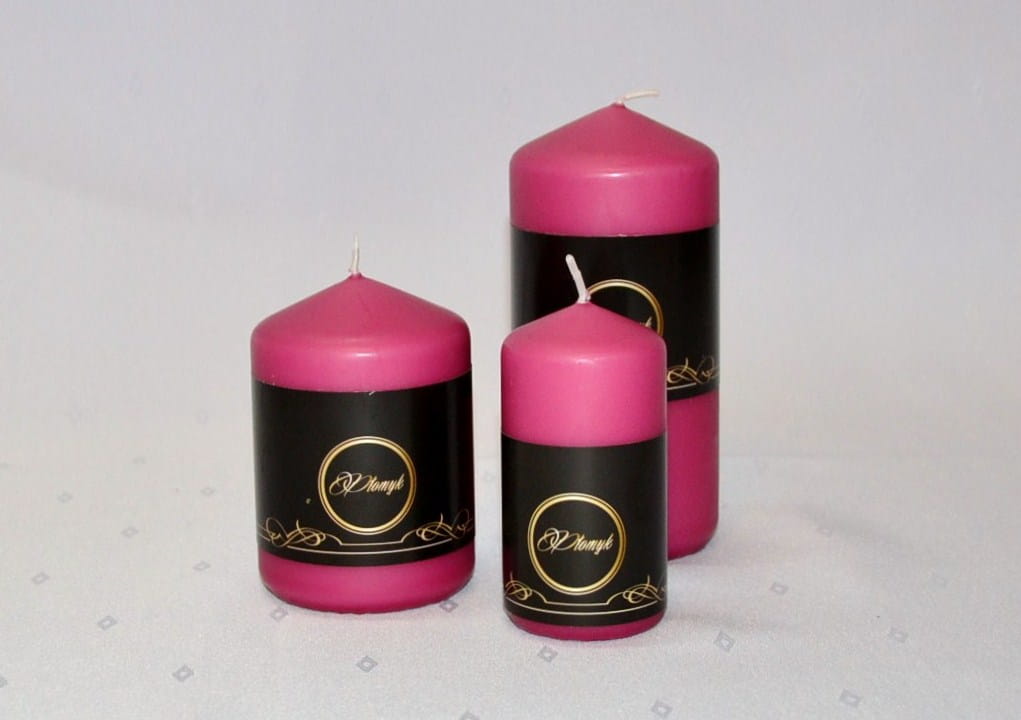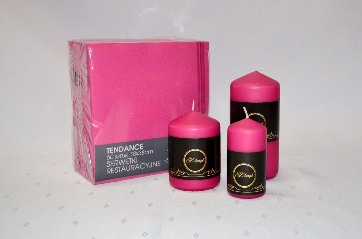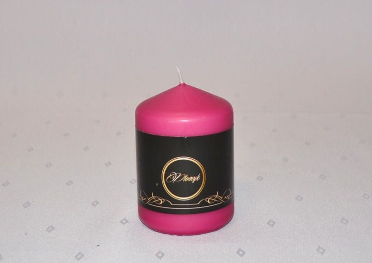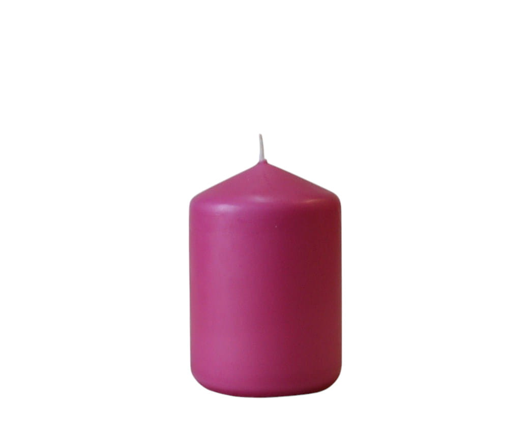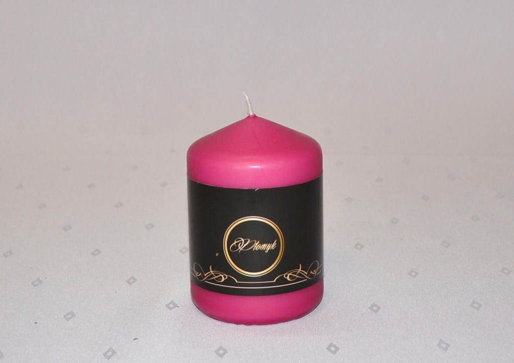 KOLOR RÓŻOWY CIEMNY. Świeca słupek o wysokości 10 cm i średnicy 7 cm, matowa, niekapiąca, wypala się do środka, przybliżony czas palenia: 50 godzin, szeroka kolorystyka, produkt polski.