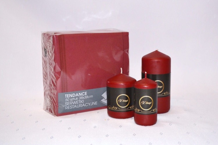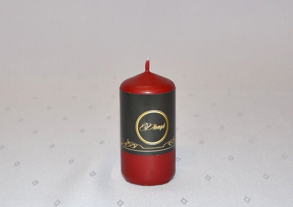 KOLOR BORDOWY. Świeca słupek o wysokości 10 cm i średnicy 5 cm, matowa, niekapiąca, wypala się do środka, przybliżony czas palenia: 25 godzin, szeroka kolorystyka, produkt polski.