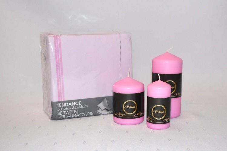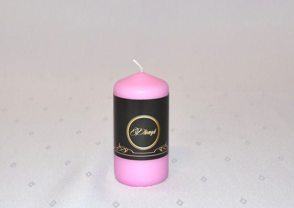 KOLOR RÓŻOWY JASNY. Świeca słupek o wysokości 10 cm i średnicy 5 cm, matowa, niekapiąca, wypala się do środka, przybliżony czas palenia: 25 godzin, szeroka kolorystyka, produkt polski.