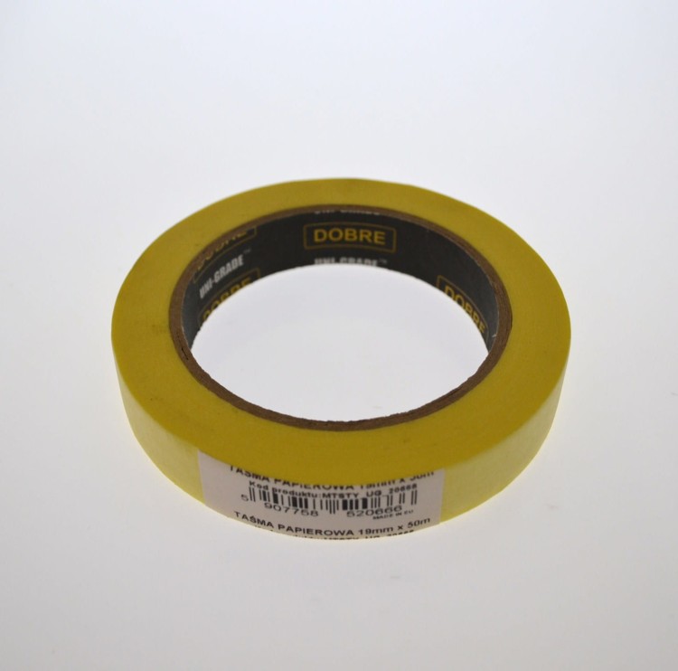 Taśma maskująca, papierowa o szerokości 19 mm i długości 50 yd. Uniwersalna, przeznaczona do zabezpieczania malowanych powierzchni, skutecznie chroni, nie zostawia śladów kleju, dobra przyczepność.