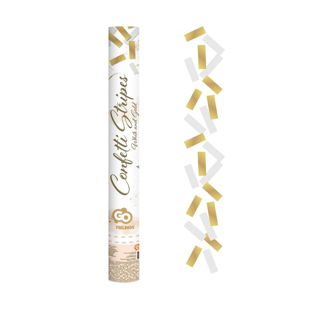 Tuba strzelająca ze złotymi i białymi paskami, wystrzeliwuje na wysokość 6 - 8 metrów za sprawą sprężonego powietrza, które znajduje się na dole tuby. Super atrakcja na ślub i imprezy sportowe.