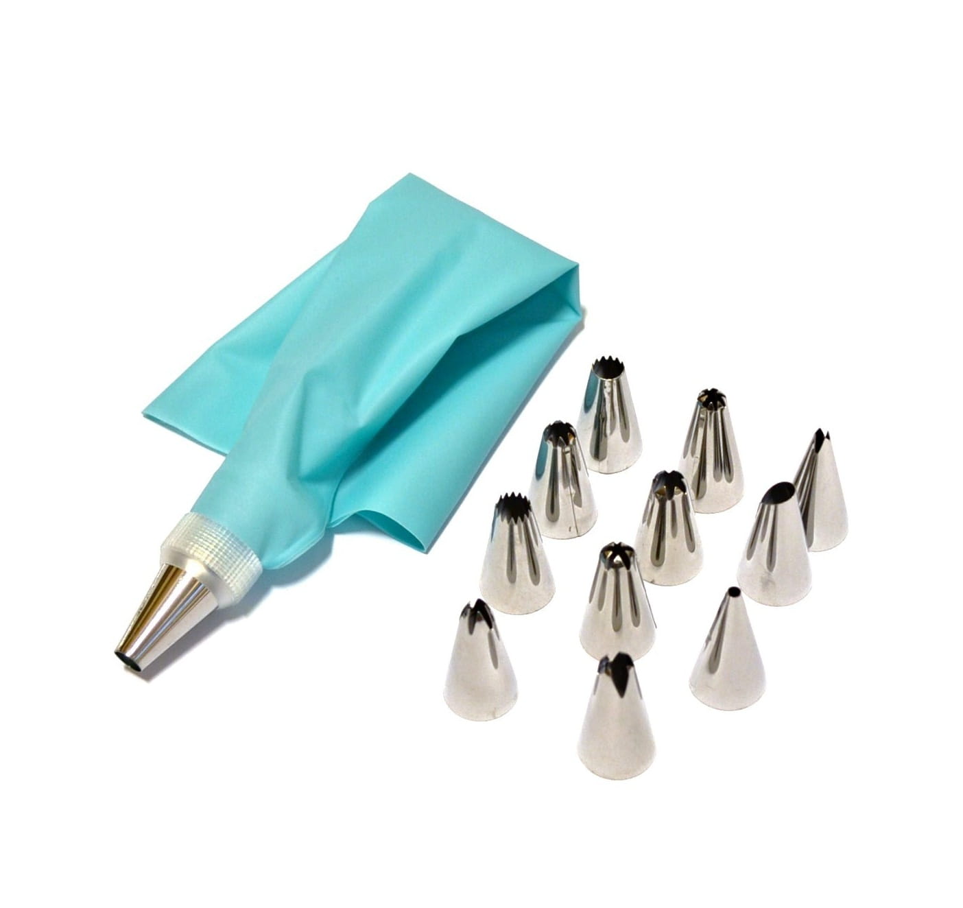 Zestaw tylek cukierniczych 12 sztuk z silikonowym rękawem wielorazowym i adapterem.