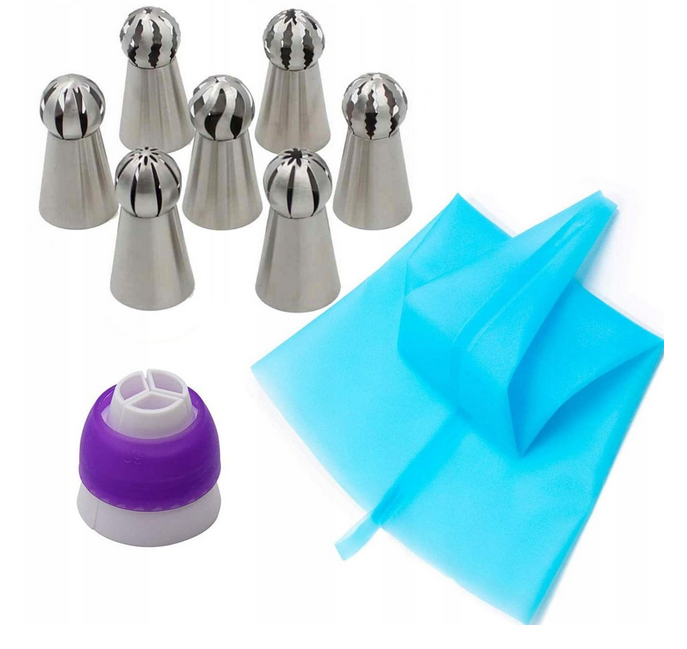 Tylki rosyjskie, malezyjskie kule duże do dekoracji, 7 sztuk różnych z adapterem i workiem wzorów do kremów, past, majonezu.