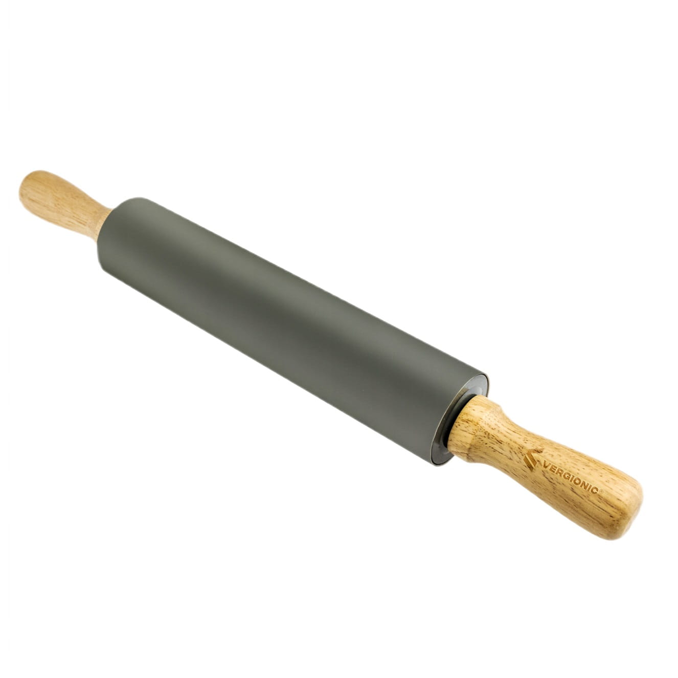 Wałek silikonowy z drewnianą rączką. Długość całkowita: 38,5 cm, długość części roboczej: 20 cm, średnica: 5 cm.