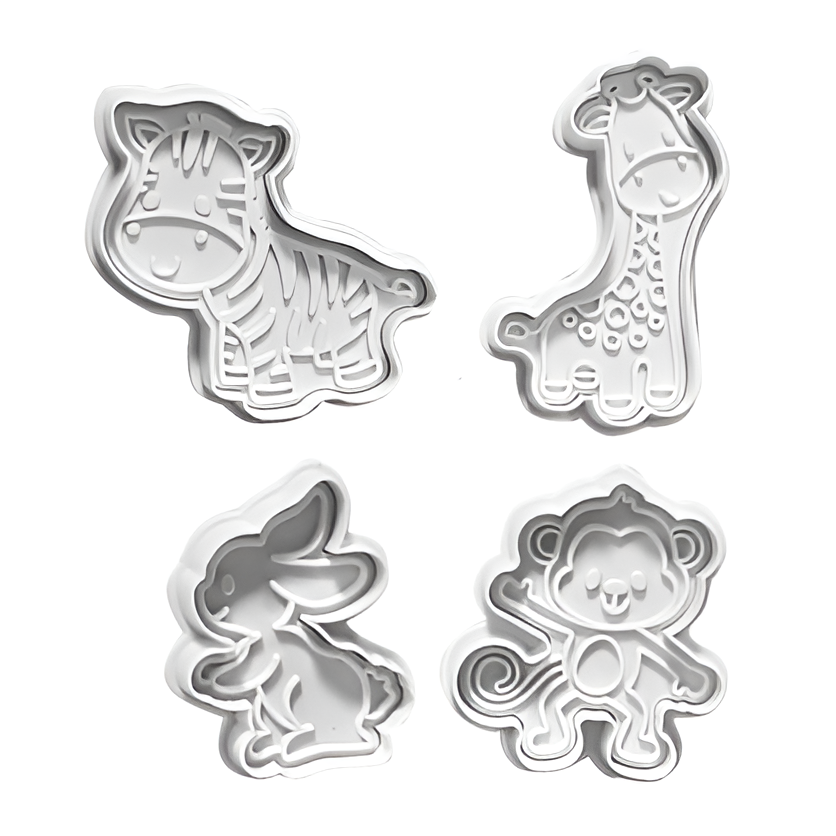Foremki wykrawacze tworzywo pakowane na blistrze z zawieszką o wielkości foremki od ok 7-9 cm do wykrawania 4 różne wzory Żyrafa, Małpka, Zajączek, Tygrysek.