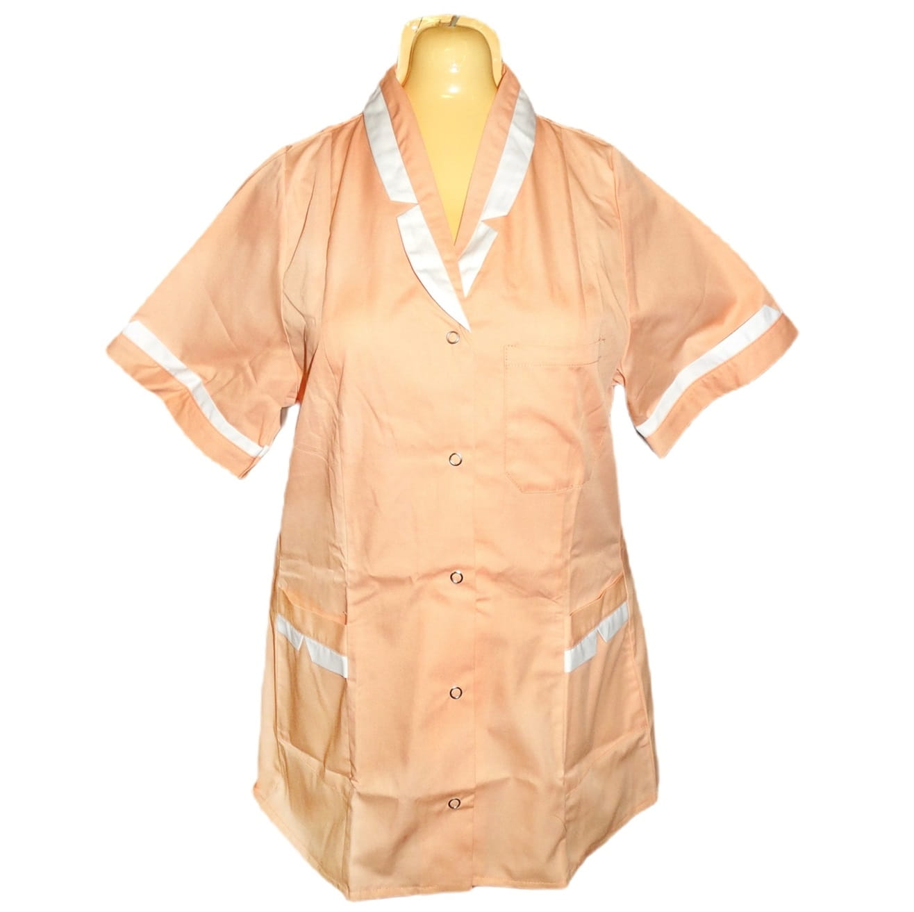 Fartuch, żakiet medyczny damski z krótkimi rękawami i dekoracyjnymi wstawkami przy kołnierzu, rękawach i kieszeniach. Materiał: elanobawełna. Gramatura: 175 g/m2.