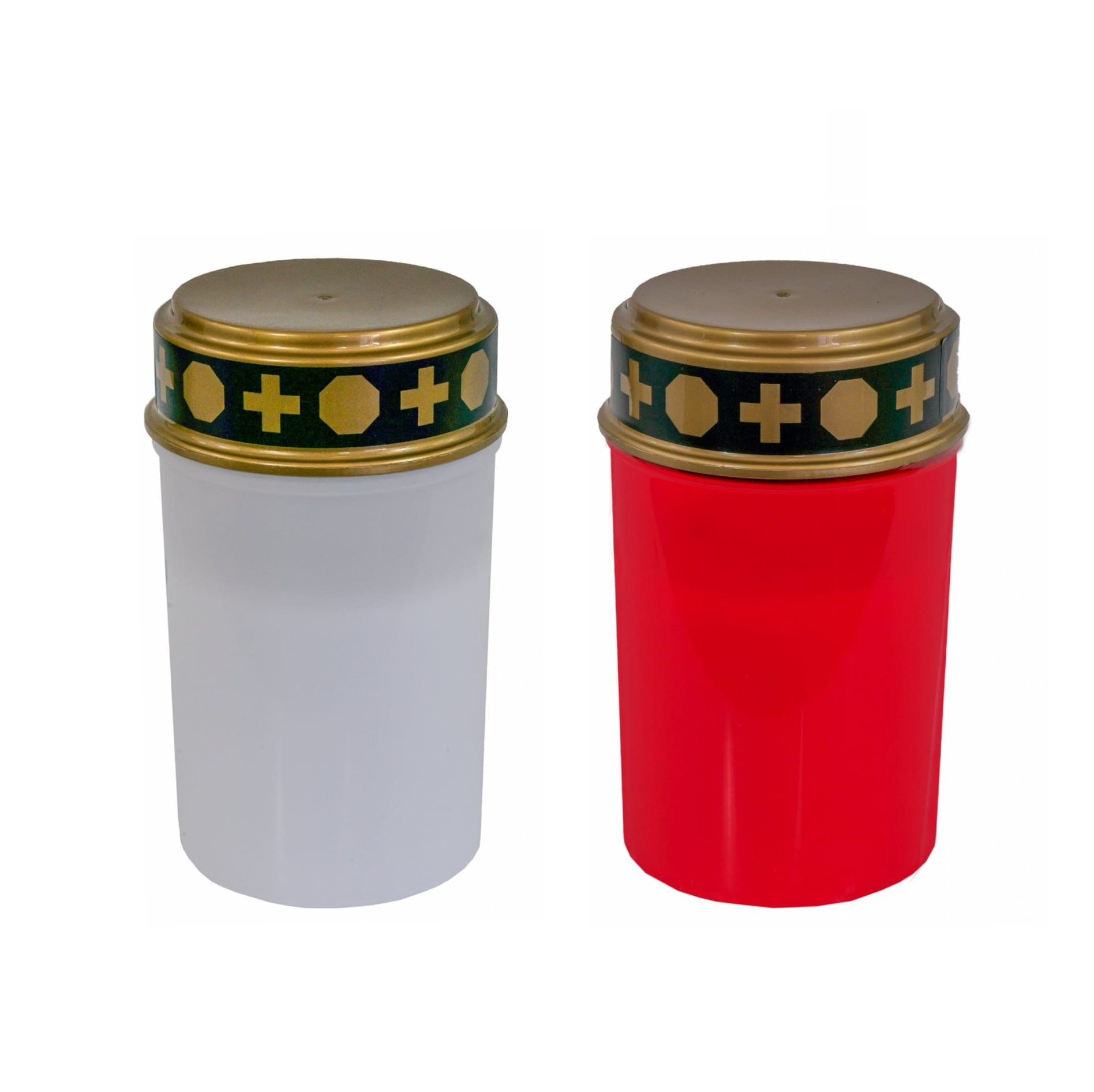 Znicz elektryczny w postaci plastikowego lampionu zasilany dwiema bateriami R14 (w zestawie). Efekt migającego płomienia świecy. Wymiary: 123 mm wys, 75 mm śr. Czas palenia do 180 dni. Dostępny w kolorach białym i czerwnym.